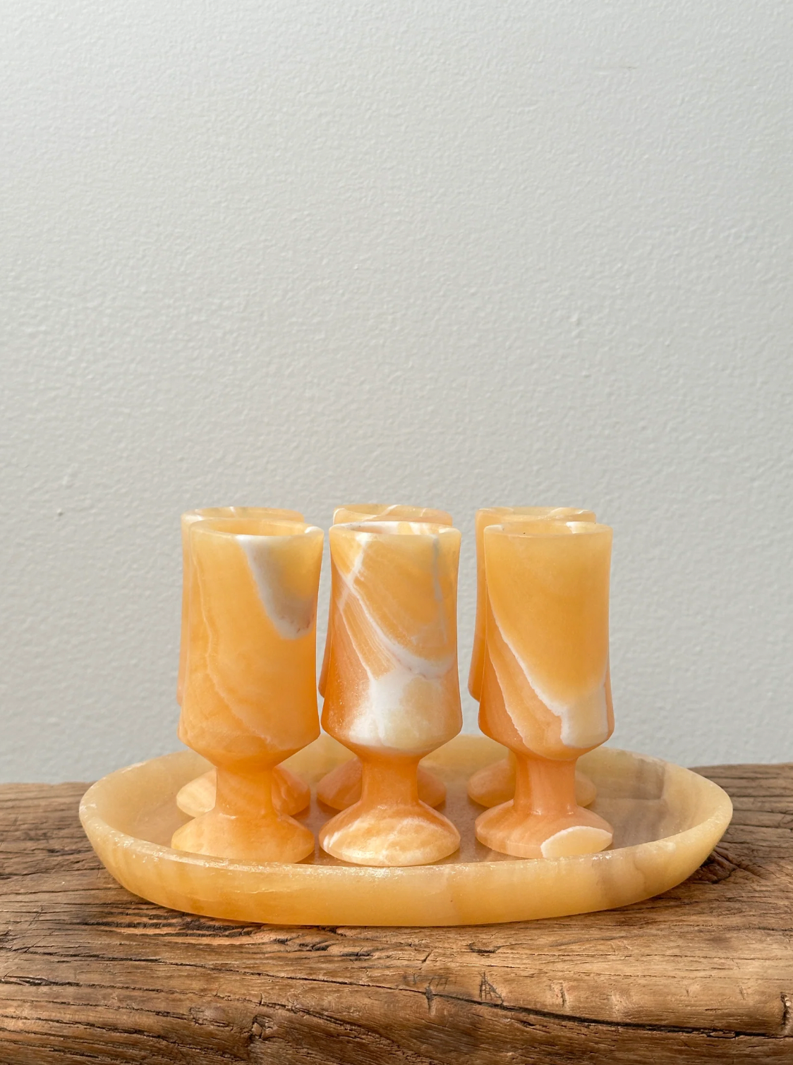 Elevate your rituals with this handcrafted set of six fluted tequila cups and a matching oval plate, carved from rich yellow onyx by artisans in Mexico. The natural stone’s golden tones and delicate veining make each piece uniquely beautiful — no two are exactly the same. Designed to turn any pour into a moment, the fluted shape adds sculptural elegance to the table, while the plate keeps everything gathered in one graceful form. Ideal for hosting, gifting, or simply savoring.