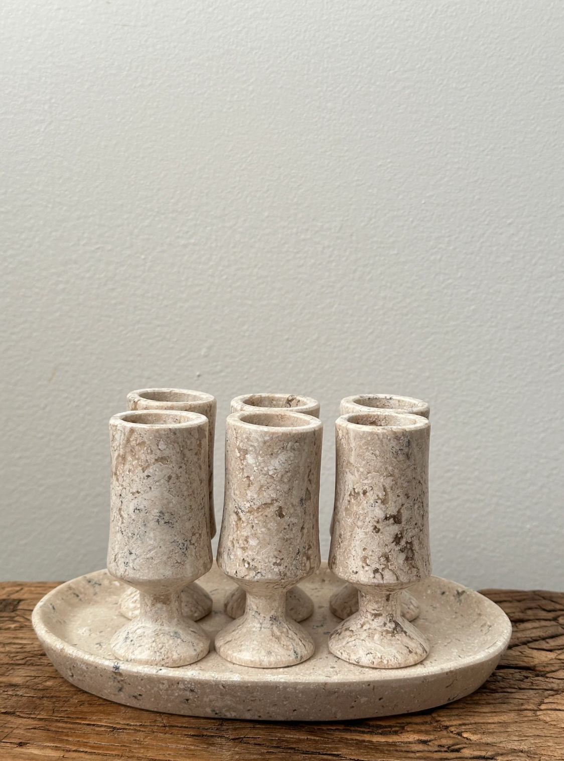 Sculptural and grounded in nature, this set of six fluted shot glasses is hand-carved from warm travertine stone by artisans in Mexico. Their ridged silhouette offers a modern take on traditional stoneware, perfect for tequila, mezcal, or espresso rituals. Each piece is one-of-a-kind, showcasing the stone’s natural veining and earthy tones.