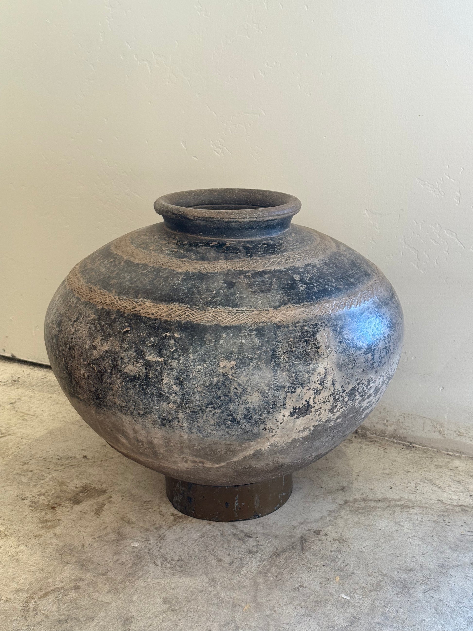 Handcrafted clay pot from India featuring a striking crosshatch pattern in warm, earthy tones with an authentic rust-inspired finish. Elevated on a sturdy iron stand, this substantial piece brings rustic charm and organic texture to any room. Perfect as a statement planter, decorative vessel, or sculptural accent that celebrates natural materials and artisanal craftsmanship.