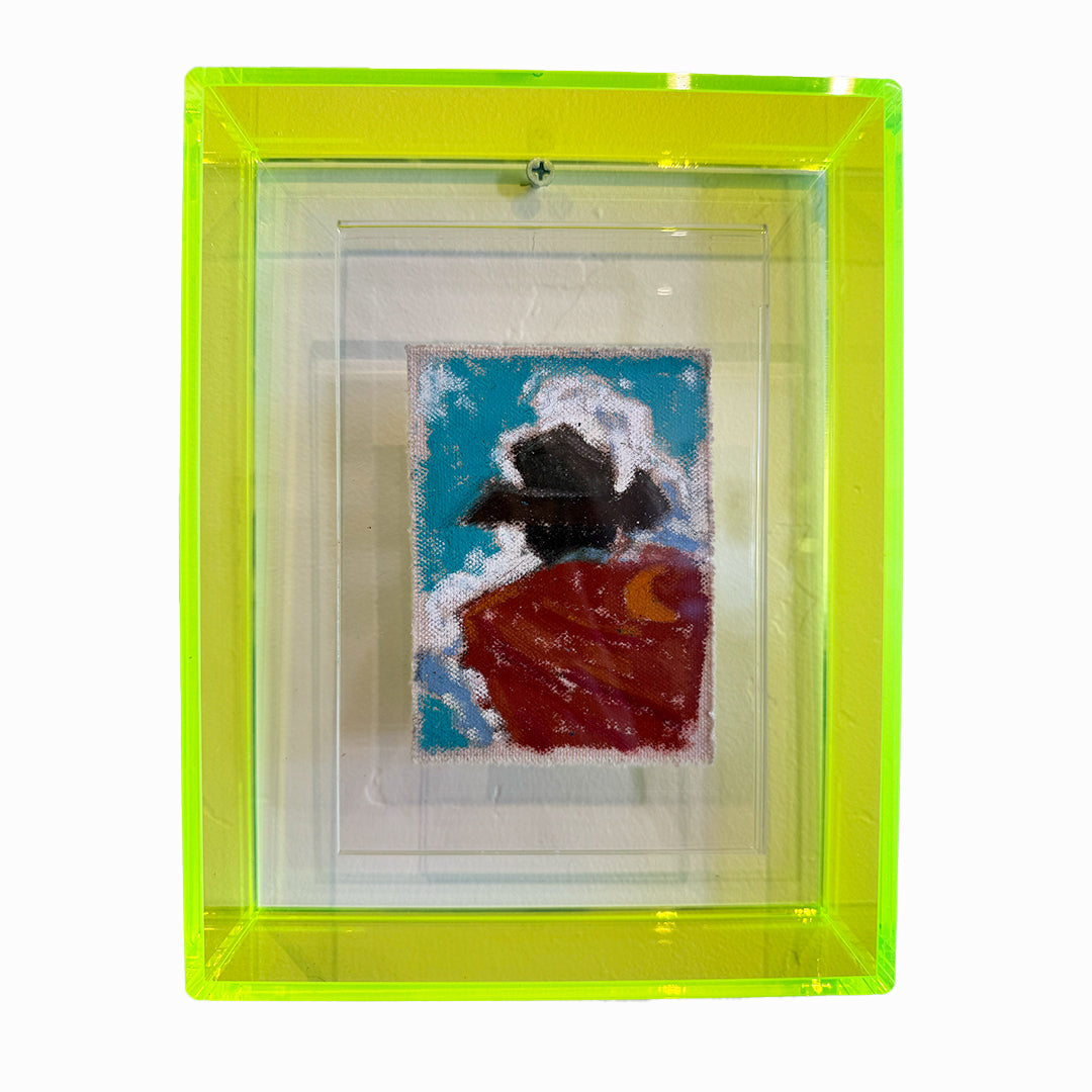 Mini oil paintings by Zach Collins, suspended in neon acrylic frames.