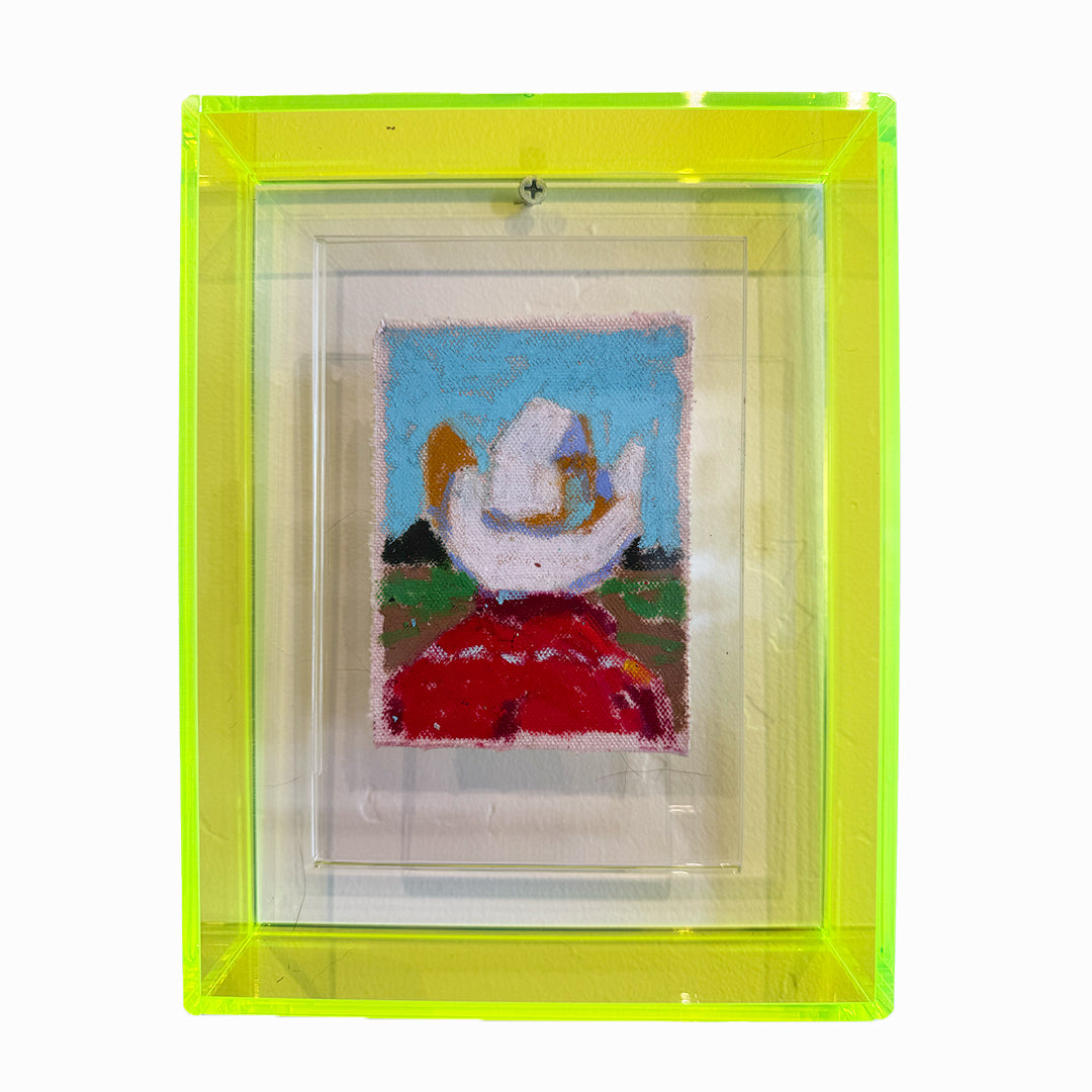 Mini oil paintings by Zach Collins, suspended in neon acrylic frames.