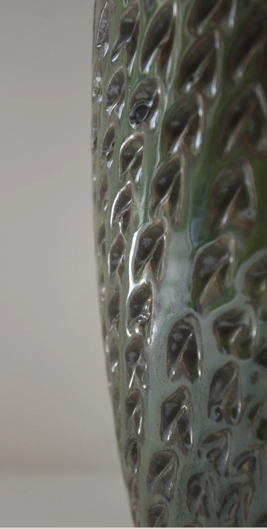 15.5in H x 6.5in W. Tall textured vase glazed with layers of different greens. Glazed white on the inside and rim.