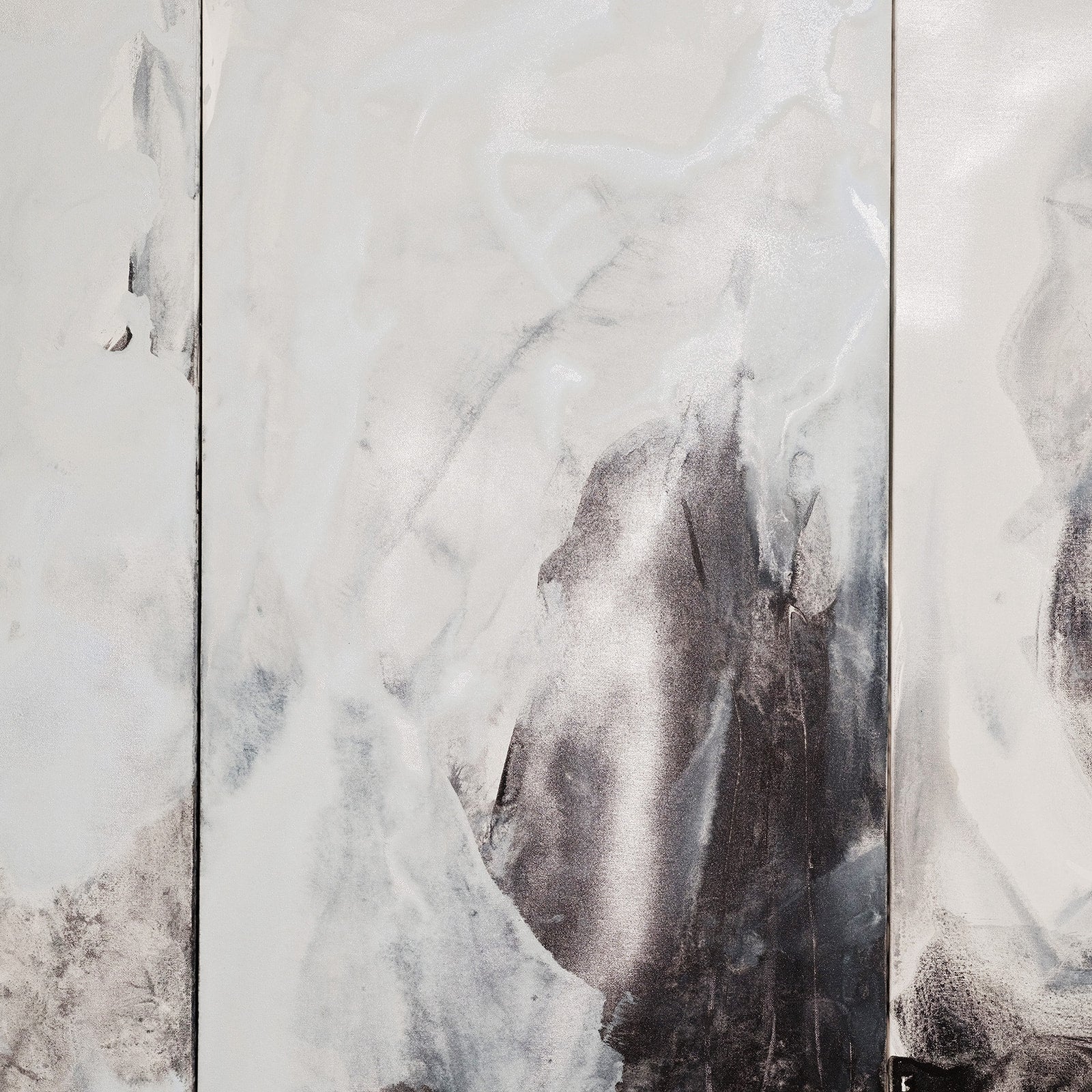 Gabs translates this phenomenon through silver sparkles layered on lighter works and yellow dots dispersed across darker canvases, evoking the presence of fireflies. The interplay of dark and luminous hues reflects the gradual shift between day and night, while the translucent layers capture the essence of twilight’s soft glow.